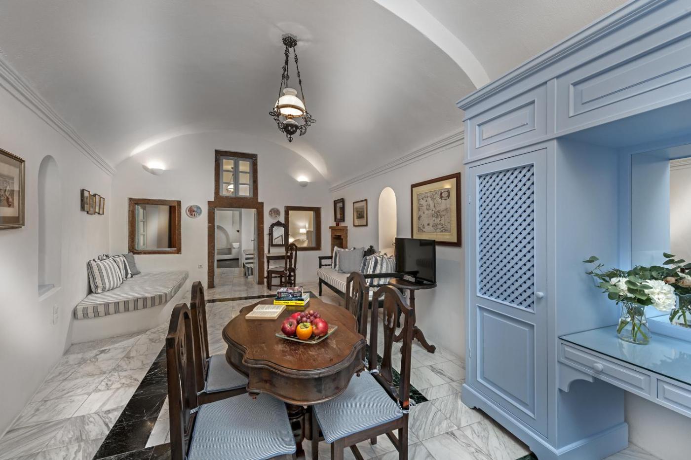 Ambassadors Sunset Suite. This two floor house, features views of the northeastern part of the caldera, with a large private terrace overlooking the volcano, the sunset and the beautiful church of the 18th century. It consists of 2 sitting areas, one at the first floor and the other at the ground floor with a large living and dining area, a spacious bedroom and 2 bathrooms, one of them with Greek marble. It is decorated with classical antiques and furnishings. Please note that due to safety reasons children cannot be accommodated in this room type. ;