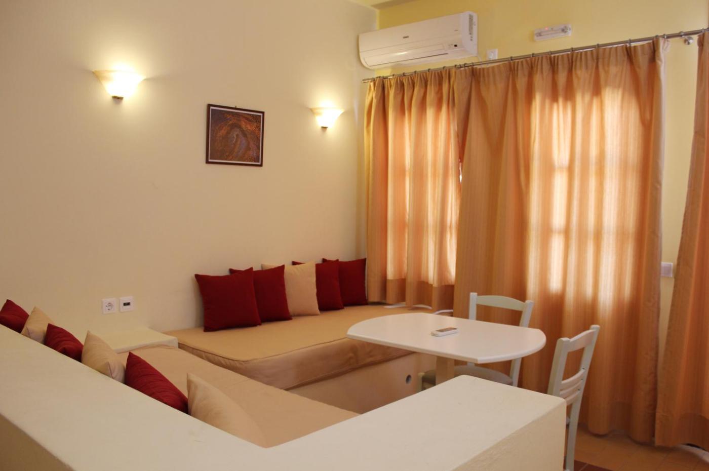 Traditionally decorated in light colours,air-conditioned suites open to a private balcony or patio with garden, volcano or Aegean Sea views. Each includes a seating area with a flat-screen TV. Free toiletries and a hairdryer are provided.
