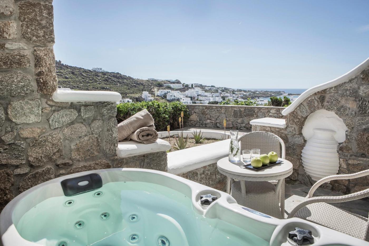 Each of the elegant suites and rooms is air-conditioned and includes a seating area, a flat-screen TV with satellite channels and furnished private balconies.units in the hotel are equipped with a coffee machine, hair dryer and ironing facilities. Korres toiletries can be found at the private bathroom. Some units also feature a private pool or hot tub.