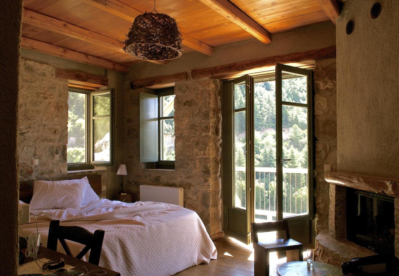 Deluxe Double Room with Balcony and Fireplace. Offering views over the lush greenery of Mount Parnonas, this traditionally decorated room has beamed ceilings and stone walls. Most units come with a furnished balcony, while some of them are split level. Guests are offered a late checkout. ;